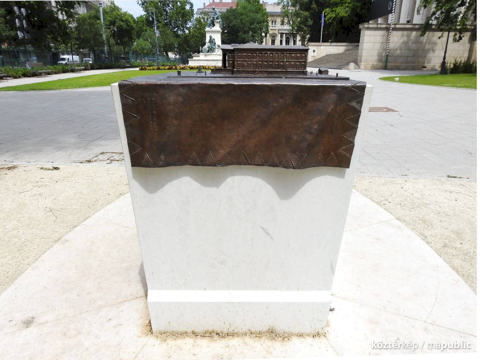 A makett, zászlóval takart felületén, a kert középpontjában a múzeum épülete áll. Előtte az ikonikus lépcsősor az oszlopsor előtt. A timpanonban Pannónia és "udvartartása" https://www.kozterkep.hu/10308/a-nemzeti-muzeum-timpanonjanak-diszitoszobrai ... az épület előtt Arany János frissen felújított szobra https://www.kozterkep.hu/2594/arany-janos-emlekmu