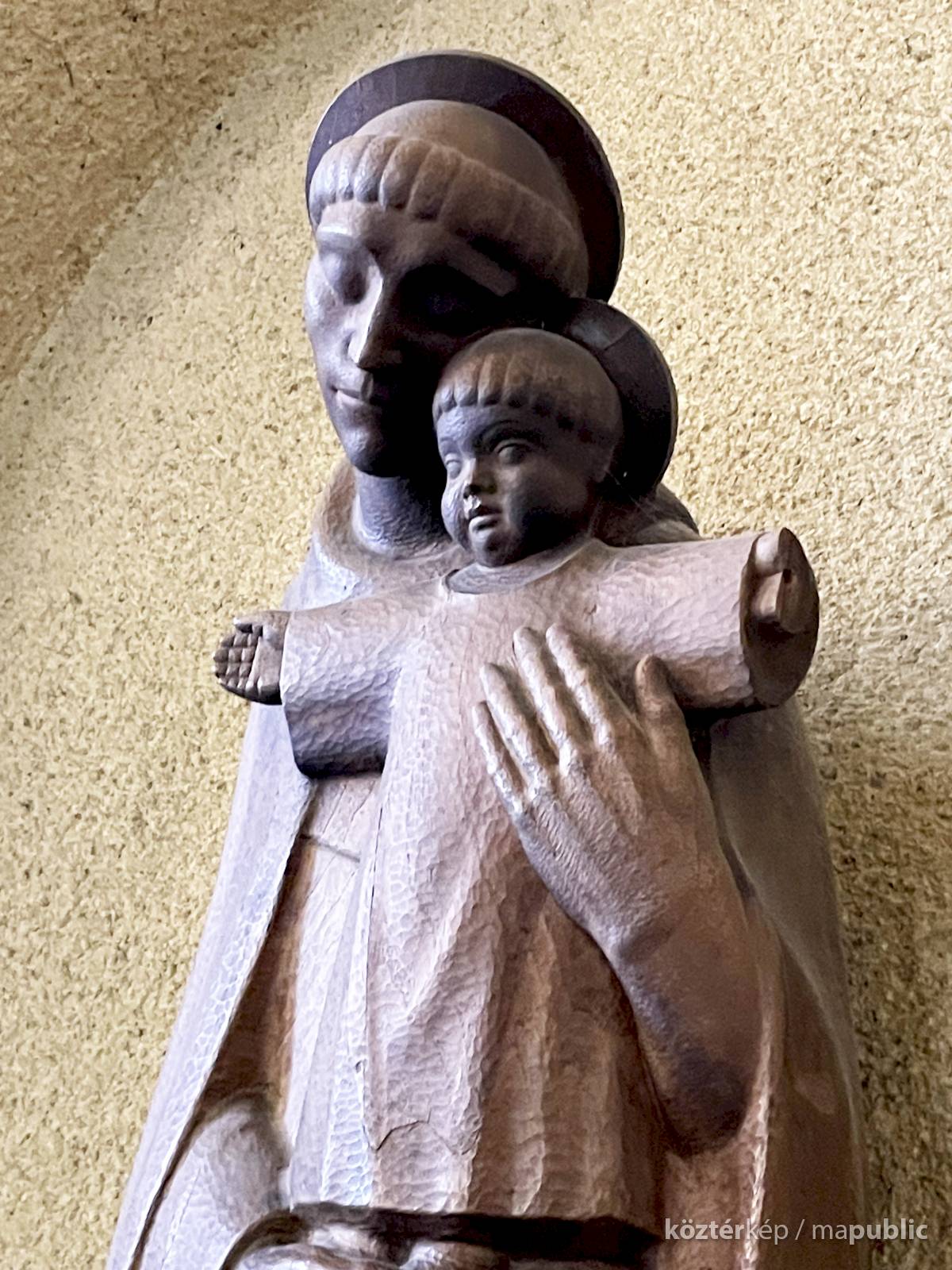 A templom egyik legsötétebb helyén lévő alkotás. Többszöri látogatásom során sem sikerült szignót találni rajta, ami az alkotó irányába vinne. Hosszú időbe telt, amíg megtaláltam. Kifejezetten izgatnak azok a fából készült alkotások, amik a hasonló paraméterű többséggel ellentétben láthatóan avatott kézből valók. Utólag rá kellett jöjjek, nem voltam körültekintő, nem figyeltem a szobornak arra a változatára, ami a pasaréti templom előterében áll és műlapját éppen én csináltam 2013-ban. (Most pedig megtaláltam a nevet a templom honlapján...)