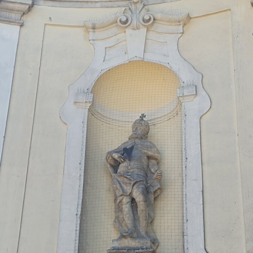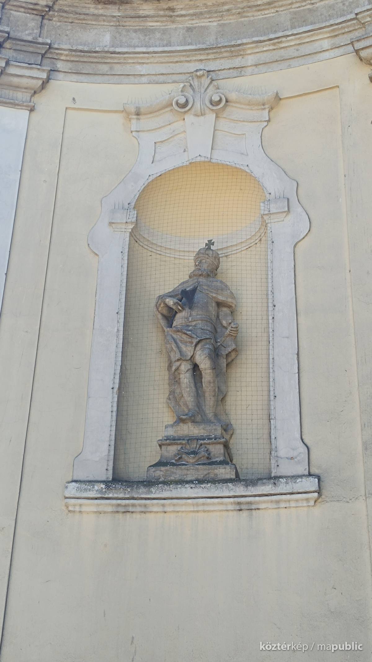 A templomot 1761 és '82 között emelték Mayerhoffer János tervei szerint. A képen jól látszik a szobor kezében lévő bárd. A szobor szépen keretezett fülkében helyezkedik el. 2009.03.09. 00:12