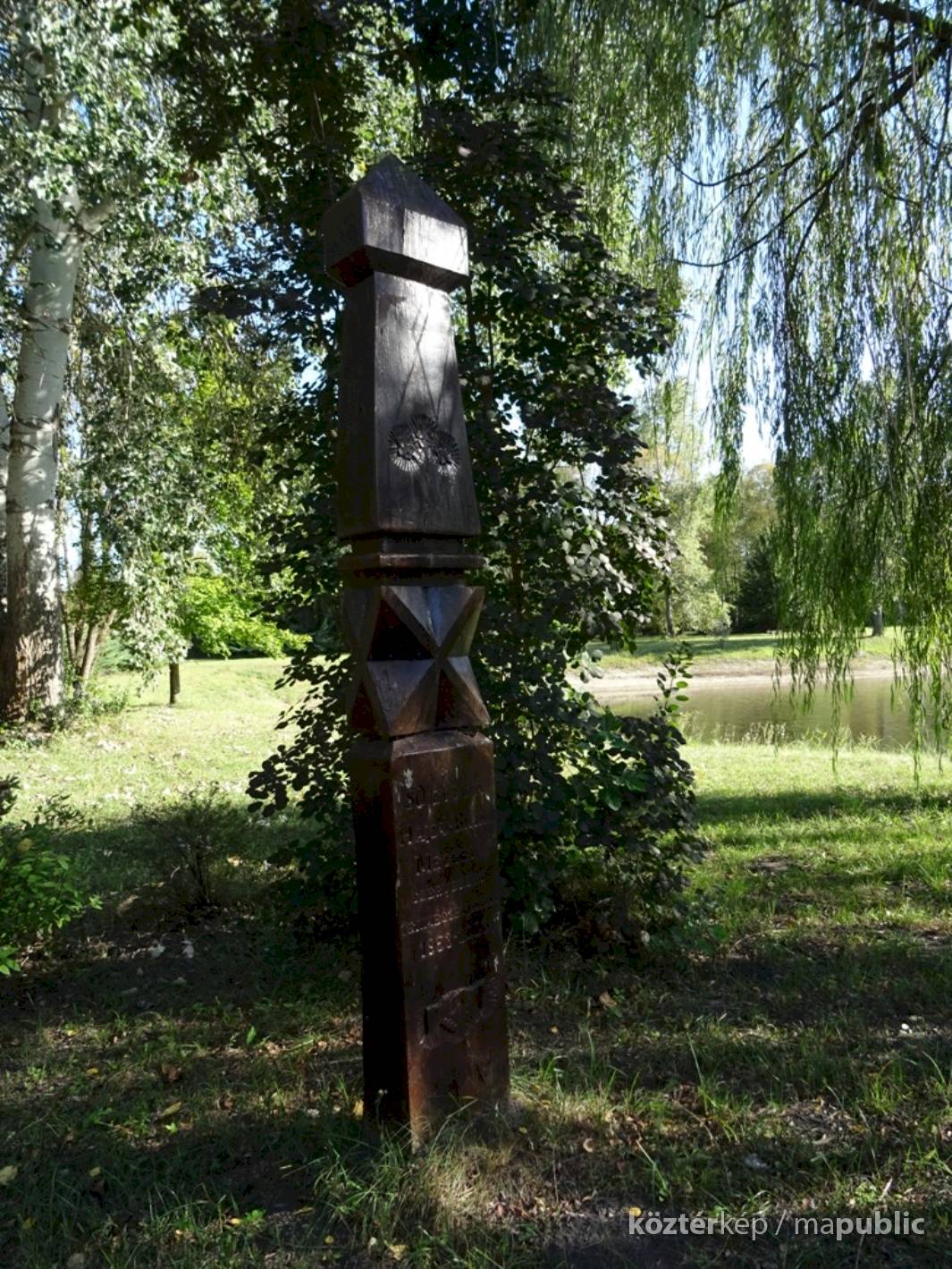 Az emlékoszlop magasabb mint két méter, és viszonylag jó állapotban van, a korához képest. Gondolom, időnként kezelik a fát, mint a körben álló szobrokat...