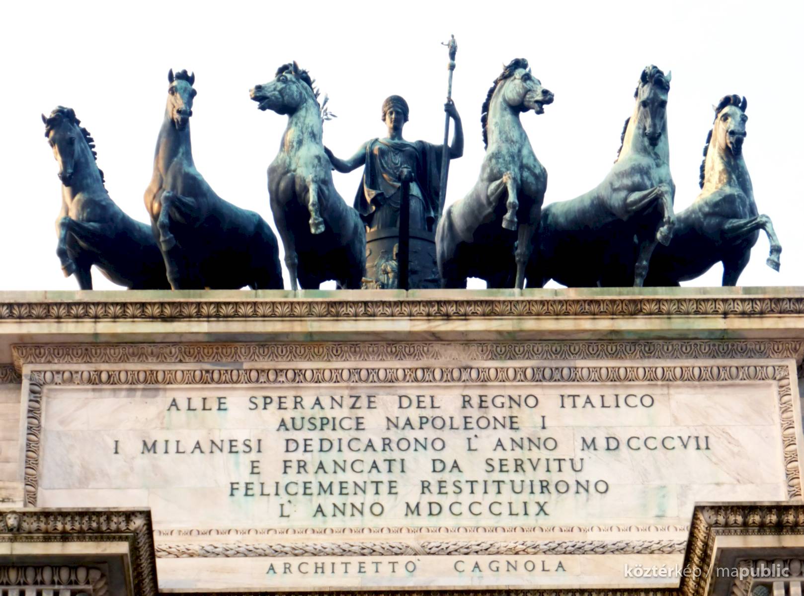 "Alle speranze del Regno Italico / auspice Napoleone I / i Milanesi dedicarono l'anno MDCCCVII / e francati da servitù / felicemente restituirono / MDCCCLIX".