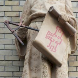 A két szobrot összehasonlítva a különbség abban van, hogy az épületen levő szobor színtelen, a ruházat egyszerűbb, és a jobb kézben körző van, tehát nem mondhatni, hogy teljes rekonstrukció.
