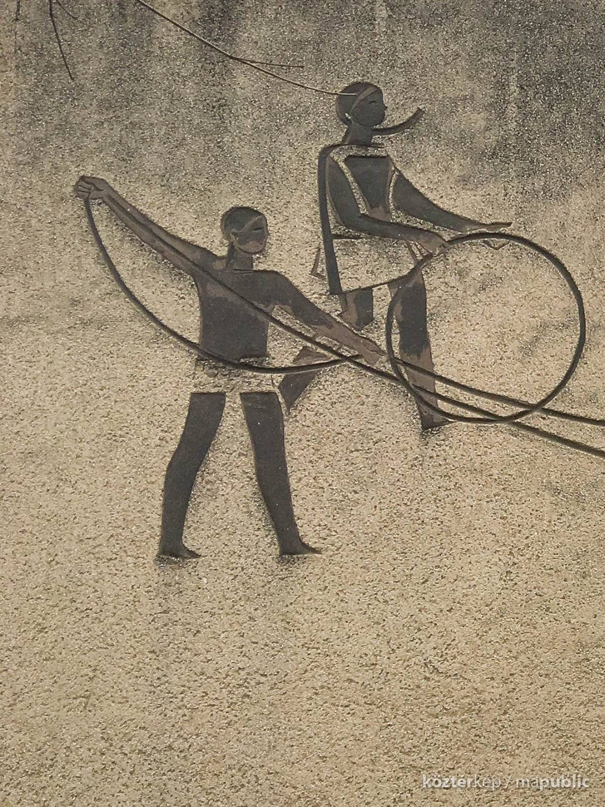 Nemrég a városba vitt az utam és gyorsan ki is használtam a kínálkozó alkalmat, elkanyarodtam az iskola irányába. A tornaterem belső udvari falán látható a sgraffito. A négy fiút és két lányt ábrázoló alkotáson hárman éppen sárkányröptetés előkészítésével foglalatoskodnak, a murália bal oldalán lévő lány karikával játszik, jobb szélén az egyiknek a kezében ásó, másik mintha egy könyvet tartana.