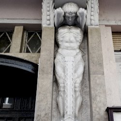 Ez az igényesség jellemzi az épület belsejét is, ahol emlékeim szerint 2013-ban benn is jártunk, de megnyilatkozik a kaput őrző két egyformának tűnő, de apróságokban mégis talán eltérő atlasz-szobor formavilágában is (itt nem a fej felett elvezetett villanyvezeték "sokszínűségére" gondolok), "akik" a bejárat két oldalán láthatók. Vállukkal támasztják, hátukon tartják meg az öt emeletnyi óriási tömböt. Megformálásuk egyértelműen Franz Metzner stílusát idézik. [1][2]