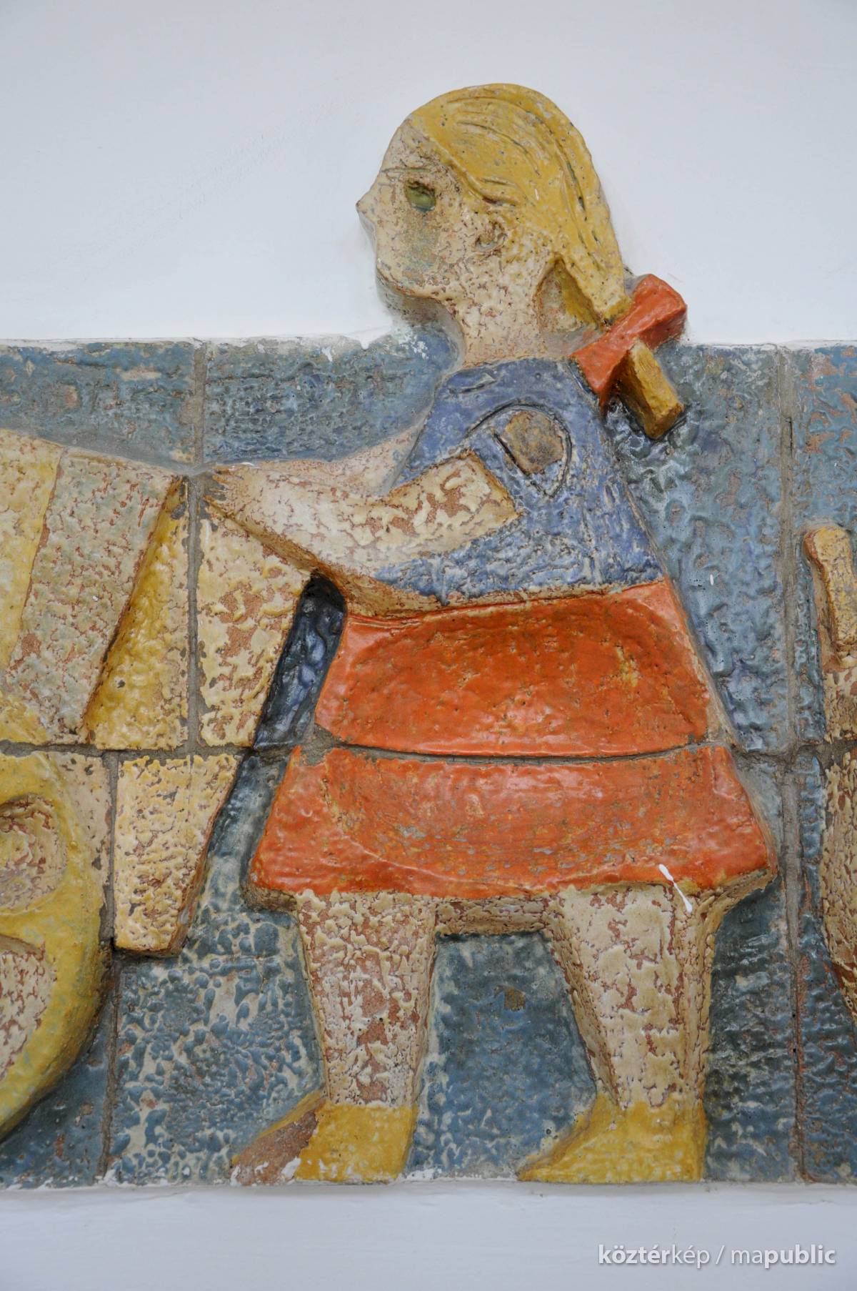 Elsőként Csekovszky Árpád Munkácsy-díjas (1963) keramikus [1] [2] műalkotása ragadta meg a tekintetemet. A Mesefigurák című alkotáson emberek és állatok menete látható. Vannak itt tyúkok, kecskék, kakas, kordét húzó csacsi. Közöttük megbújik több kis virág és egy aranyos süni is. A sor végét egy csiga zárja, mely fölött az alkotó szignója látható évszámmal: "CSEKOVSZKY 1965"