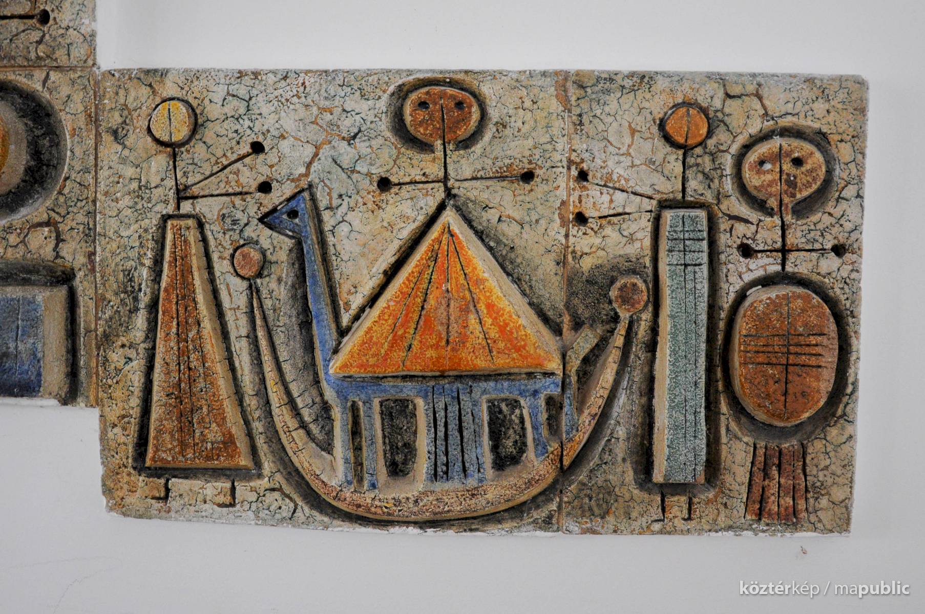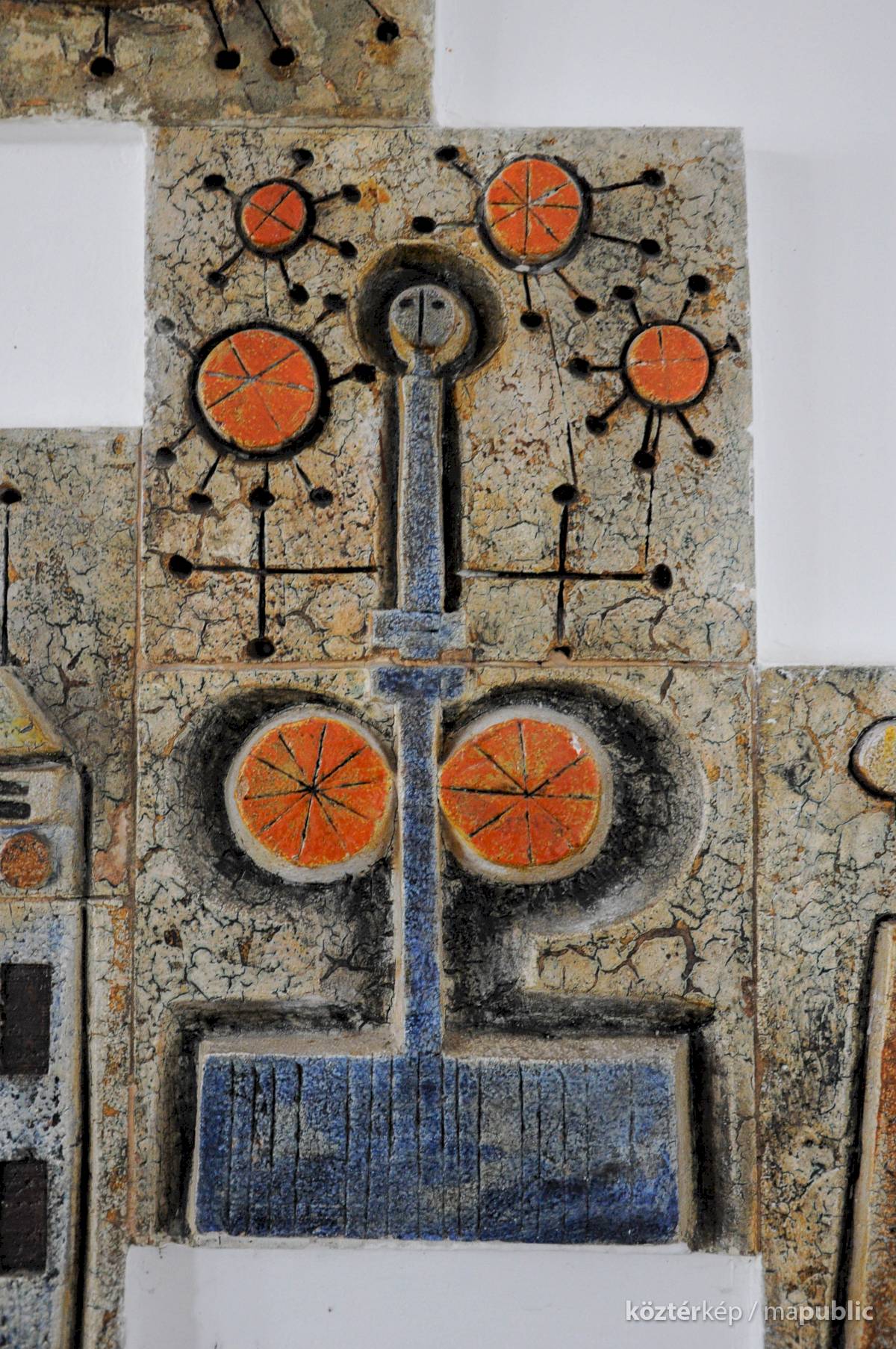 Benkő Ilona Munkácsy-díjas (1976) iparművész, keramikus [1] [2] kettő falikerámiát is készített az intézmény számára. Mindkettő murália a folyosón található. A művésznő életrajzát már korábban tanulmányoztam, több alkotását is bemutattam a Köztérképen. Pályája elején a 60-as évek közepén gyermekotthonoknak, bölcsődének, óvodának készített mázas kerámiákat.