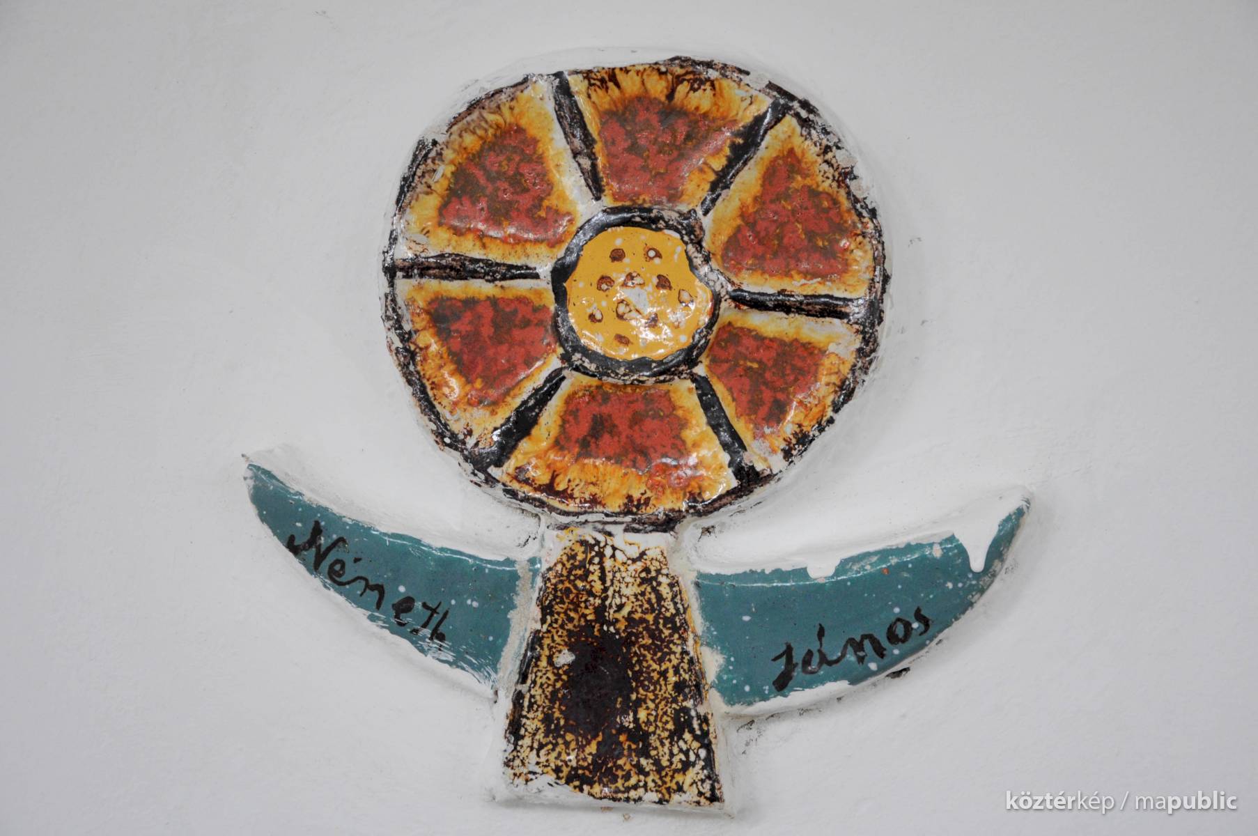 A folyosói alkotások közül az előző műlapon már bemutatásra került Csekovszky Árpád falikerámiája, most következzék Németh János, a Nemzet Művésze címmel kitüntetett (2014), Munkácsy- (1970) és Kossuth-díjas (2014) magyar szobrász, keramikus [1] [2] alkotása. Életrajzi adatok alapján ez volt a második köztéri alkotása és teljesen eltér a tőle megszokott anyag-mázas samott formavilágtól. [3] Az 1965-ben készült színes mázbevonatú alkotás elsőre olyan, mintha egy gyermekrajz lenne; annak puritán egyszerűségével és színvilágával szikrázó napsütésben legelésző tarka-barka ökröcskéket ábrázol. A falikerámián az ökröcskéken és a napocskán kívül még fák és egy virág láthatóak, melynek levelein az alkotó szignója olvasható.