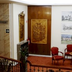 Étel, ital (bőségkosár, fagylalt), zenei kíséret (hegedű, pán-síp), mérnöki eszközök, festőpaletta, a gyógyítást jelképező tekergő kígyó (a fürdő gyógyvizére utal), egy boroskancsó, azon a világ térképe... hiszen minden út ide vezet. Fenn, kétoldalt a hotel kupolái veszik közre az iniciálét, alul a szálloda neve kiírva.