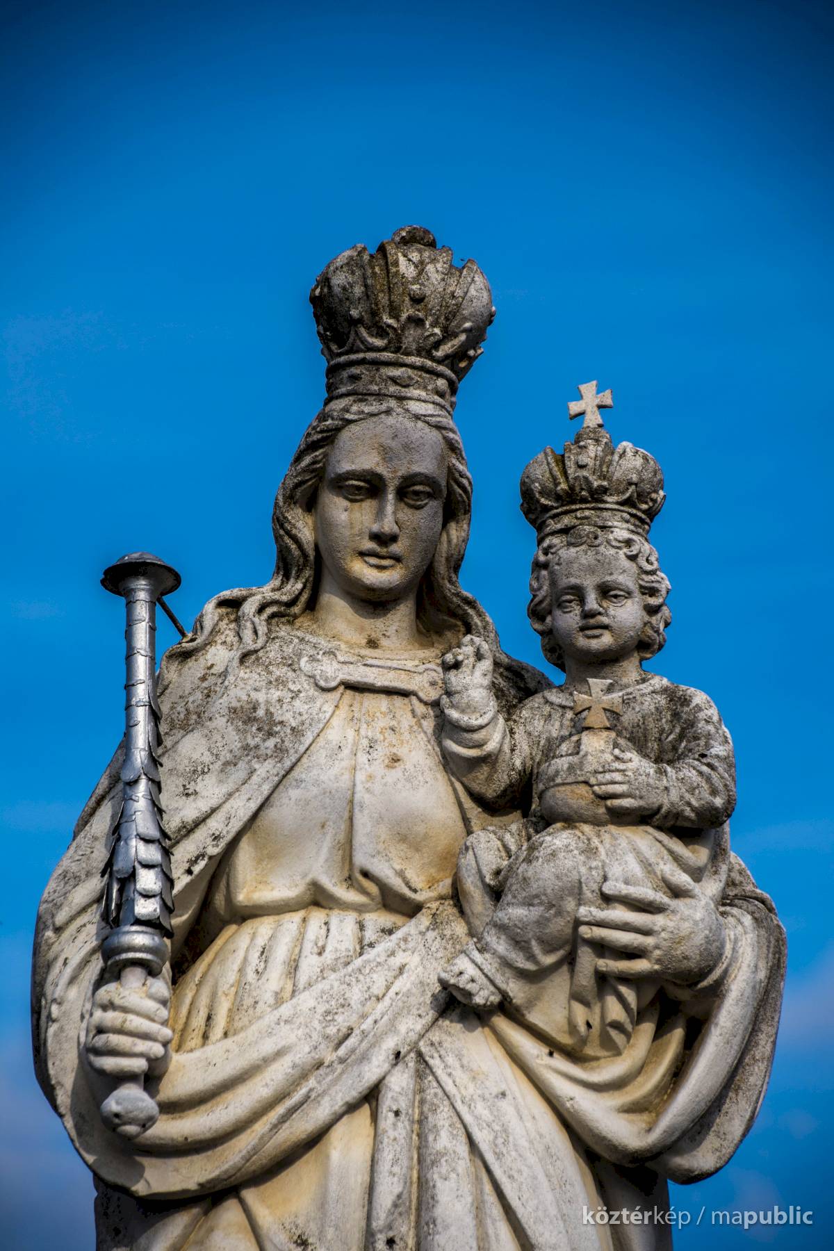 Szűz Mária koronás fővel, jobbjában fém jogarral, bal kezében a gyermek Jézus a kereszttel ékesített országalmával, Ő is koronát visel.