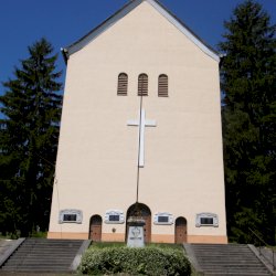 A templom keleti falán világháborús emléktáblák vannak egy vízszintes sorban. Szám szerint négy darab. Ebből a két szélső az I. világháborús, a két belső a II. világháborús áldozatok emlékére vonatkozik. A méretük és elhelyezésük azonos. A belső és a külső domborművek lényegében hasonlóak, kis eltérések vannak csak. Mindezekért nem négy, nem is kettő, hanem egyetlen műlapot készítettem.