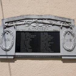 Balra és jobbra egy-egy ellipszis alakú növénykoszorú van. A koszorúk belsejében 1914 1918 illetve 1941 1945 évszámok láthatók.