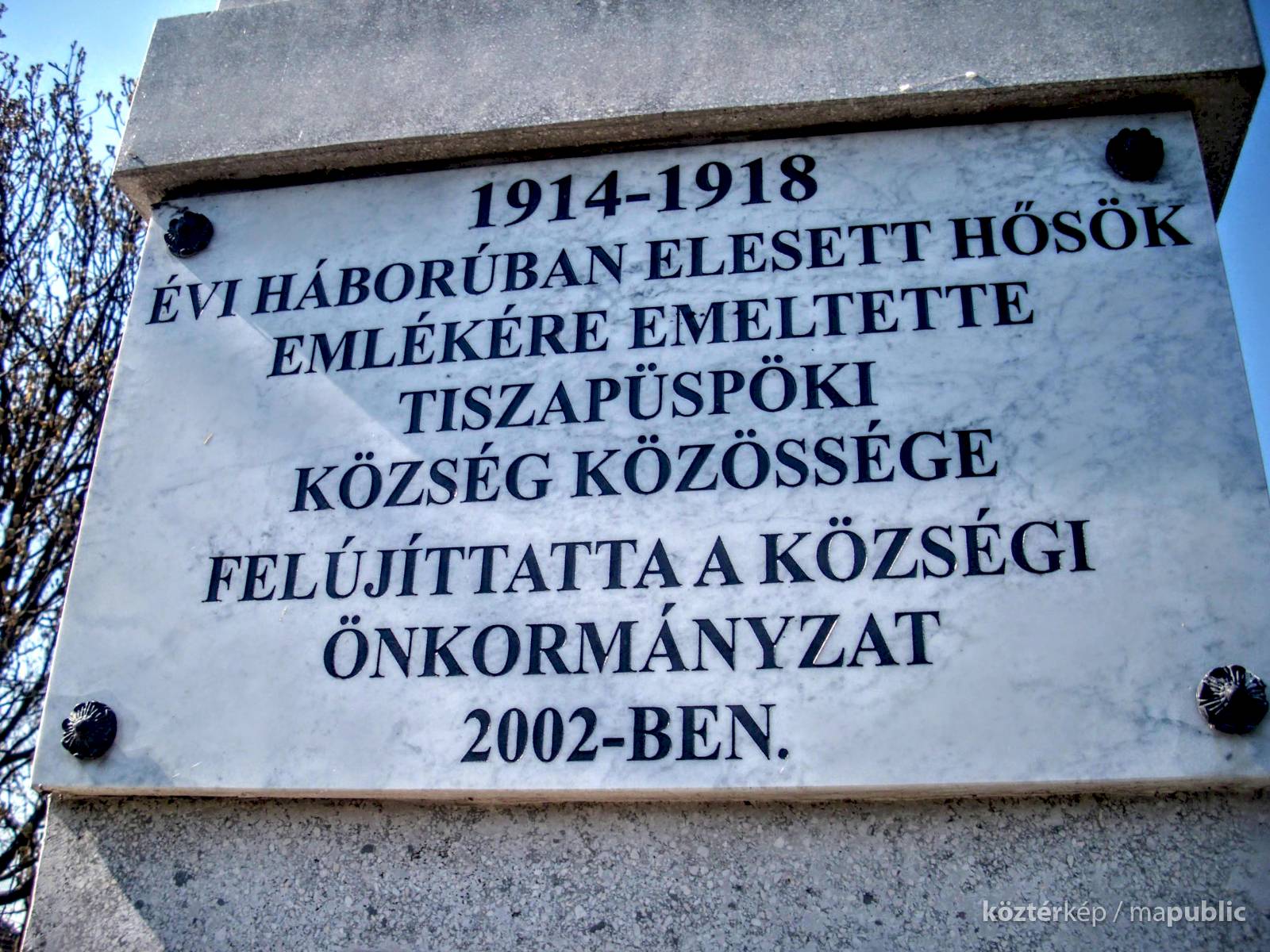 Az útról megközelítve azonban ez nem derül ki, csak majd a később megkeresett forrásban. Az emlékmű oldalain több feliratot és névsort olvashatunk a márványtáblákon. Szemben egy fehér márványtáblán levő felirat: „A második világháborúban elesettek emlékére állíttatta a községi tanács”. Alatta a település második világháborúban elesettjeinek névsora, 48 név olvasható, végül egy 1990. május 9-i dátum szerepel. Vélhetően ekkor helyeztek fel az emlékműre ezt az emléktáblát. A jobb oldalon egy domborművön a koronás magyar címer, felette egy márvány emléktáblán olvasható, hogy az „1914-1918 évi háborúban elesett hősök emlékére emeltette Tiszapüspöki község közössége / felújítatta a községi önkormányzat 2002-ben”. A templom felöli oldalon 72 név szerepel, fehér márványtáblán.