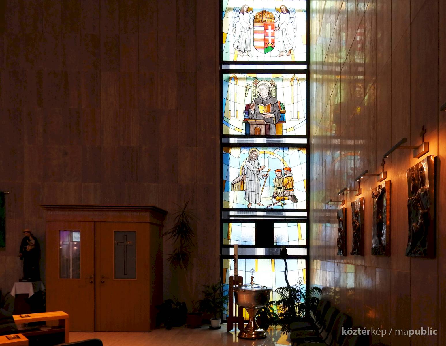 Az üvegablakon ábrázoltak: Flüei Szent Miklós, Aquinói Szent Tamás, a magyar államcímer, Szent István és Mária a Gyermek Jézussal.