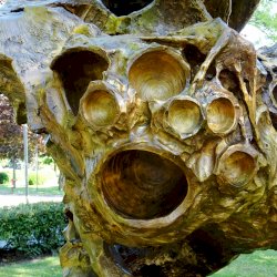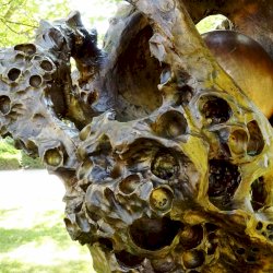 Ha spirál, a fejlődés, annak vonala jut eszembe: mozgás, dinamika...., örvénylés. Itt mindezt látom, ezért is kellett körbe-körbe járni, néha megállni. Van, hogy a kisebb-nagyobb kráterek egybeállva emberi (ördögi?) arc képzetét keltik. Máshol a barlangszerű képződményben megbújó gömbről a "mag", a születés jutott eszembe.