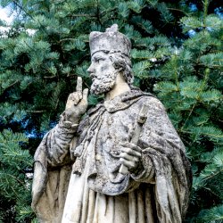 Liliomokkal díszített talapzaton Szent János embernagyságnál nagyobb méretű szobra áll.