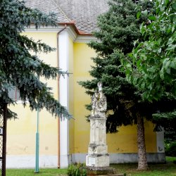 Kertjében található a Szentháromság-oszlop, ami hagyományos ábrázolásnak tűnik. A lábazatnál található tábla szerint 1885-ben emeltette Volter Mihály.