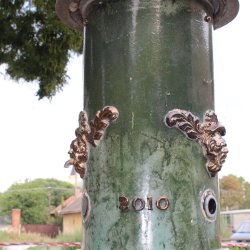 Az alsó rész külső hátsó részén egy ismertető táblán olvashatjuk az adományozók, és az alkotók névsorát, a készítés évét. Két kisebb, kék jelvény-szerű domborművön az iskola címere és az alkotói szignó látható, alul szintén két alkotó szignója a kerámiába égetve olvasható.
