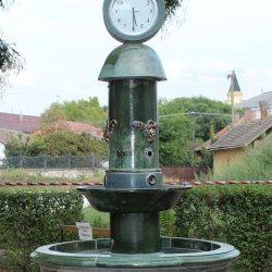 A díszkút fényes felületű, zöld és kék színű kerámiából készült. Dézsa-szerű, kilenc cikkelyből álló alsó rész közepén hengeres oszlop, tetején egy óra látható. Az alsó rész palástját növényeket ábrázoló domborművek díszítik, vadvirágok, kalászok, futó indák, és egyéb díszítő elemek tarkítják. Peremét záróelemek fedik, szélén kisebb, kék díszek láthatók. A középső hengeres rész több darabból áll, alul két részből álló gallér-szerű kis medence, a víz ezen átbukva csorgott az alsó lefolyóba. Felette négy darab rézből öntött vízköpő (jelenleg nem működik) és a készítés évszáma olvasható. A henger alsó részén egy kígyó, vagy sikló tekeredik körbe, farka felfelé, feje lefelé fordul, minden illesztést virágos, vagy gyöngyös díszítés takar. Az oszlop tetejét egy félköríves kupak fedi, annak tetején az óra látható, melyet a kút anyagából készült keretbe foglaltak, az óramű nem működik.