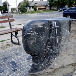Nézegettem itthon a bazaltot és elmélkedtem. Nem találtam a fonalat, vagyis az elejét, hogy is induljak el? De elérkezett az idő, levelet írtam Bodajk önkormányzatának. A város (már város!) művelődésszervezője válaszolt, aki révén második körben derült ki az alkotás címe és még némi információmorzsa. Kolléganője emlékezett a szobor állítására, íme: "...a közlekedési csomópont (buszmegálló...) felújítása során került arra a kis térre díszítésként, a szobrászművész nevezte el, nem hivatalosan "Terminátornak"." [1]