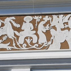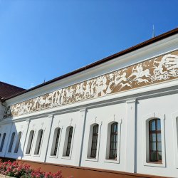 Az épület északi homlokzatán van két 1,5×24 méteres és egy 1,5×6 méteres sgraffito technikával tervezett, képírással írt fríz jellegű művészi kompozíció.