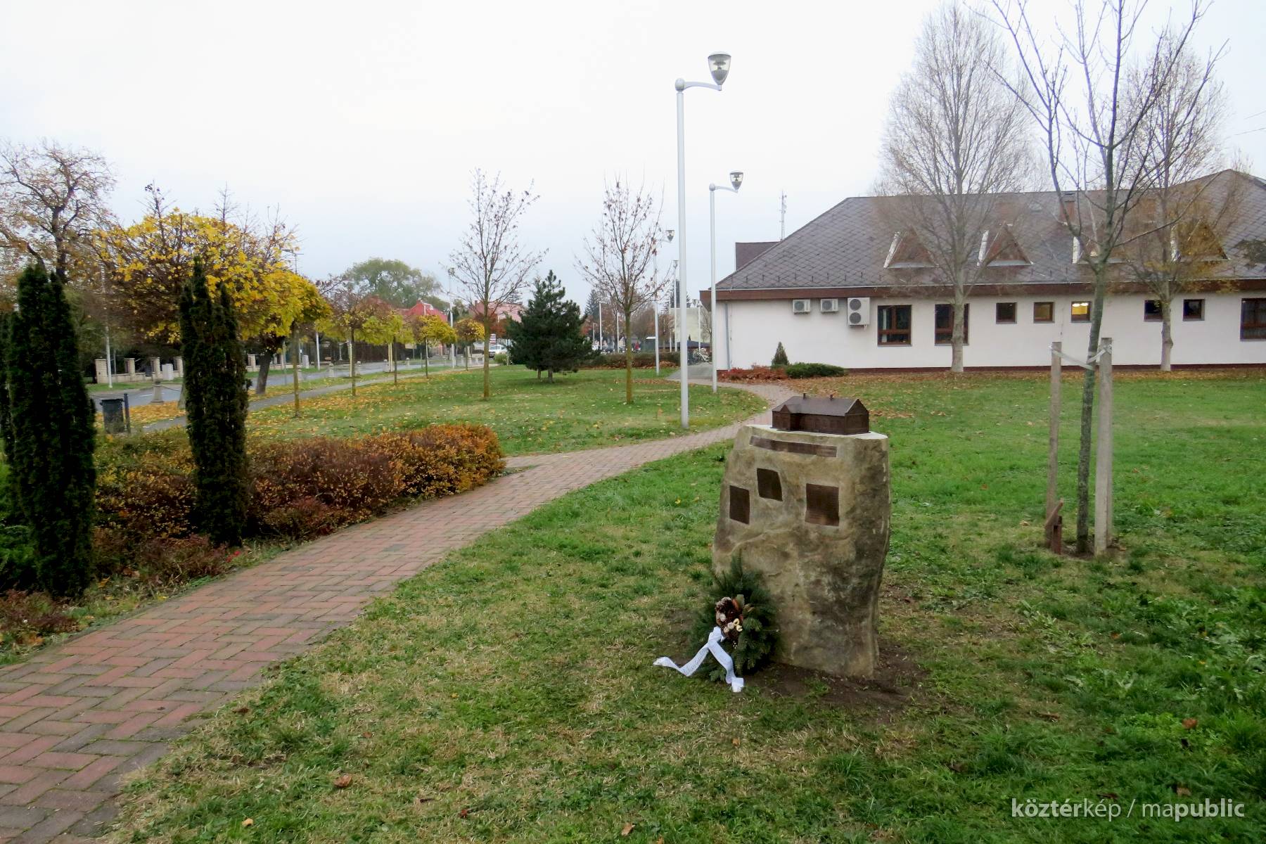 Az épület bronzból készült makettjét az alkotó egy kőtömbön helyezte el. Három kis bronzlapon, az iskola egykori tanítóinak (kántortanítóinak, segédtanítóinak) a nevei olvashatók.