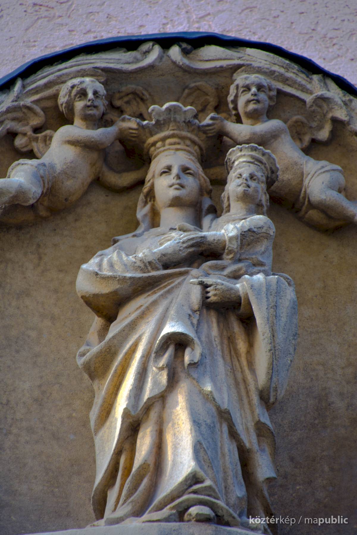 Fonatos díszítésű, félköríves fülkében Szűz Mária megkoronázását látjuk.