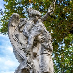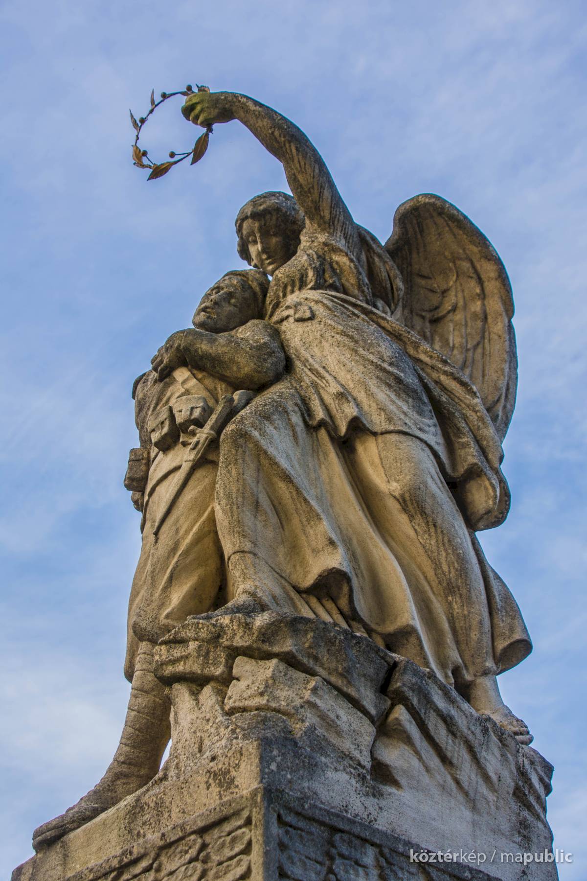 A magasan épített talapzaton embernagyságúnál nagyobb méretű, a császári-királyi hadsereg egyenruhájában lévő sebesült, vagy halálos sebet kapott katonát egy angyal ölel át. A hősök Őrangyala, vagy Szent Mihály őrangyal, a haldoklók védőszentje.[2] Kezében pedig a hősöknek kijáró babérkoszorút tartja.