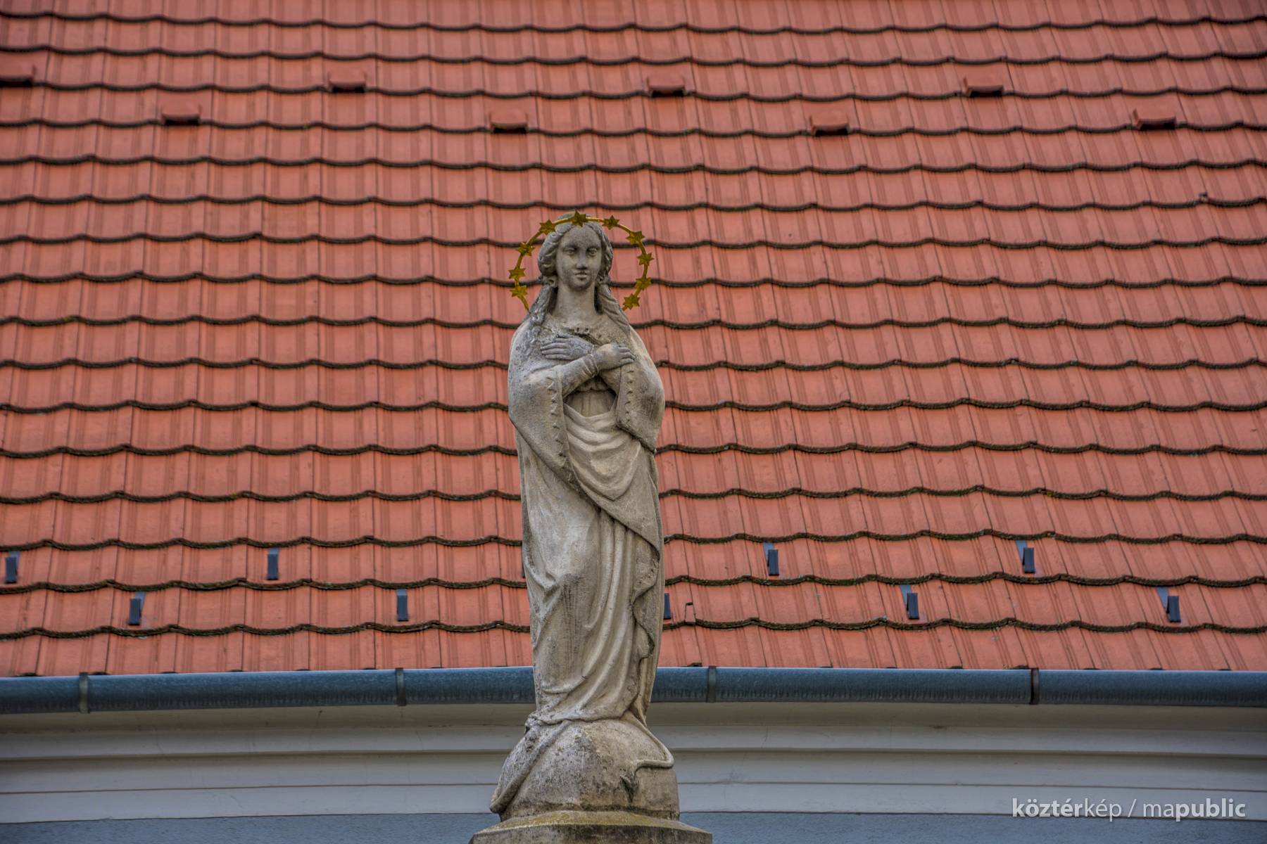 Nyolcszögű, díszes posztamensen áll a magas, ugyancsak tagolt, a szobor alatt keresztekkel díszített oszlop, amelyen a Napbaöltözött Asszony,[1] a Szeplőtelen Fogantatás szobra áll.