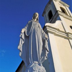 A szobor egy Immaculata ábrázolás. A kitárt karokkal a magaslaton álló, palástos Égi Anya ábrázolása eszünkbe juttathatja még a régi Mária éneket is: