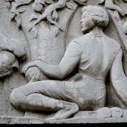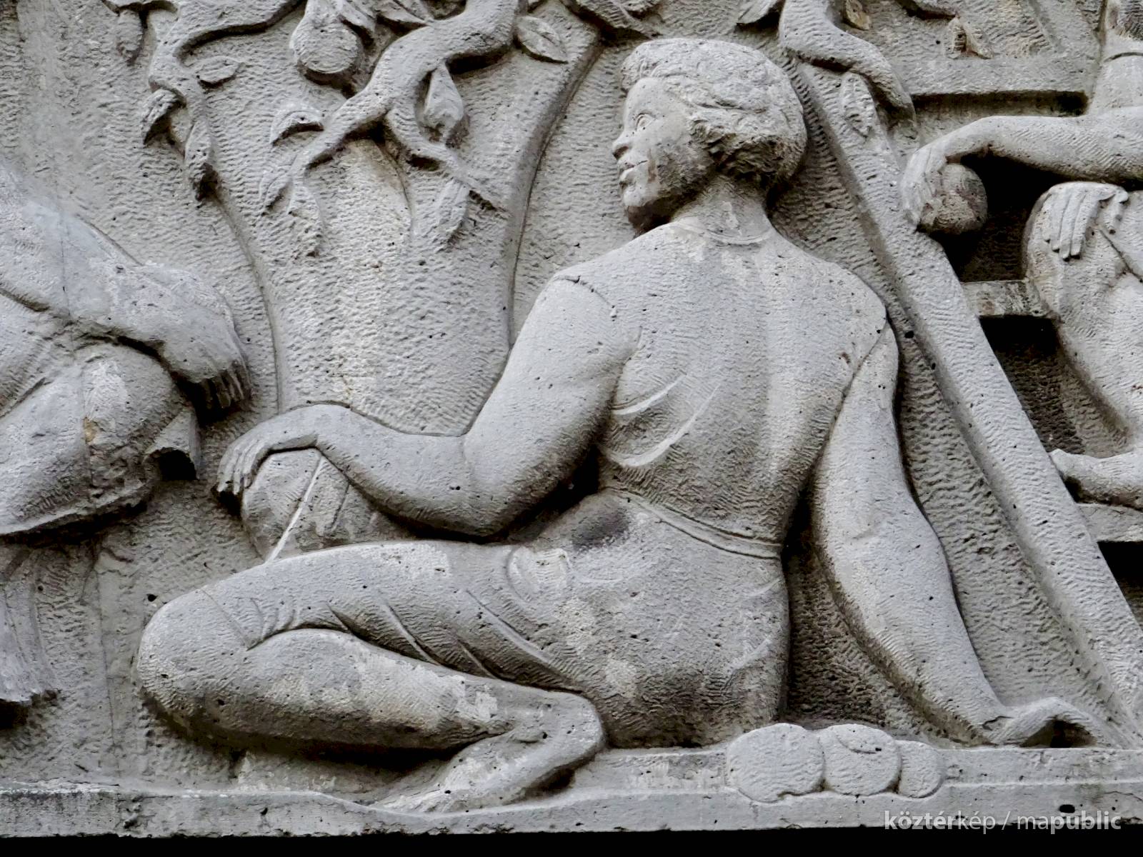 Ez a dombormű jó állapotban van, mindössze néhány helyen láthatók sötétebb foltok, egy orrocska turcsi, egy helyen megkopott valamiért. Hiába, eltelt bő 45 év létrejötte óta...