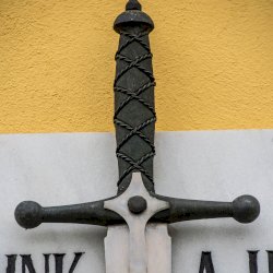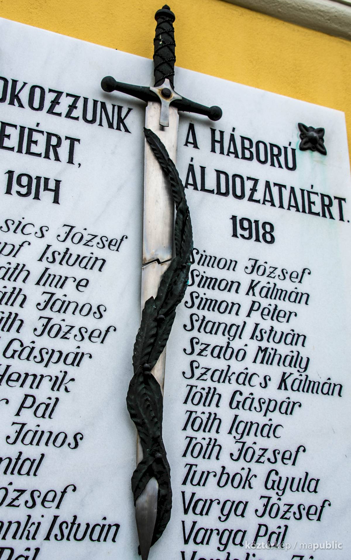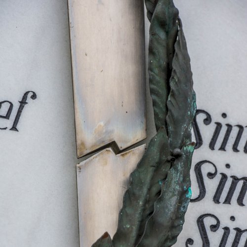 A két tábla közepén egy törött pengéjű kard szimbolizálja a vesztett háborúkat és az ott elesetteket. A pengére ráfonódó babérfonat a hősöknek járó tisztelet, a hervadhatatlan érdemek jelképe.