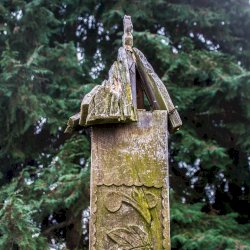 A bejárat mellett egy G. Gy. monogramú kopjafa áll. Még csak tavaszodik, de szőlőindás, szőlőfürtös faragása is Hamvas mondatait visszahangozzák bennem: