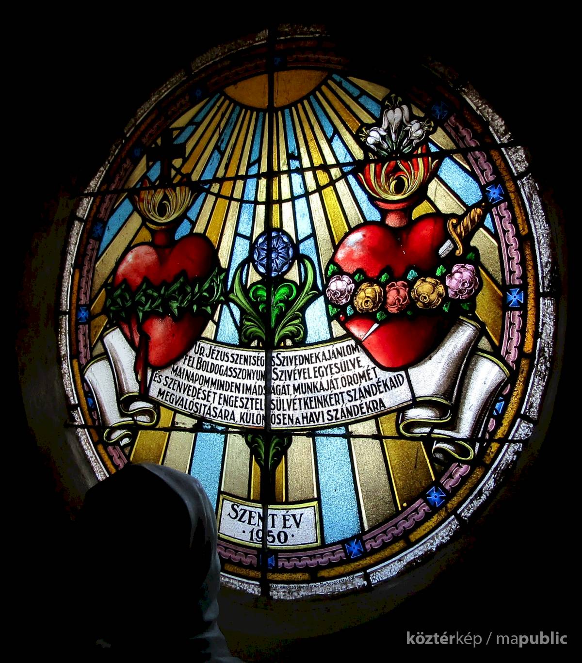 A bal oldali ablakban központi részén, Jézus vérző Szent Szíve töviskoszorúval, és Mária Szeplőtelen Szíve melyet tőr döfött át egy rózsakoszorúval ábrázolás látható. Felül a Szentlélek kisugárzása szimbóluma aranylik, alatta szalagon ima szöveg, középen lenn az 1950. Szentév felirat, alul a peremen az alkotói szignók, és a készítés éve olvasható.