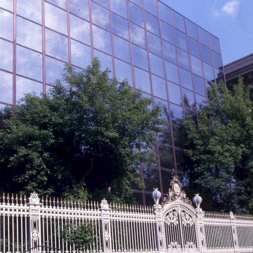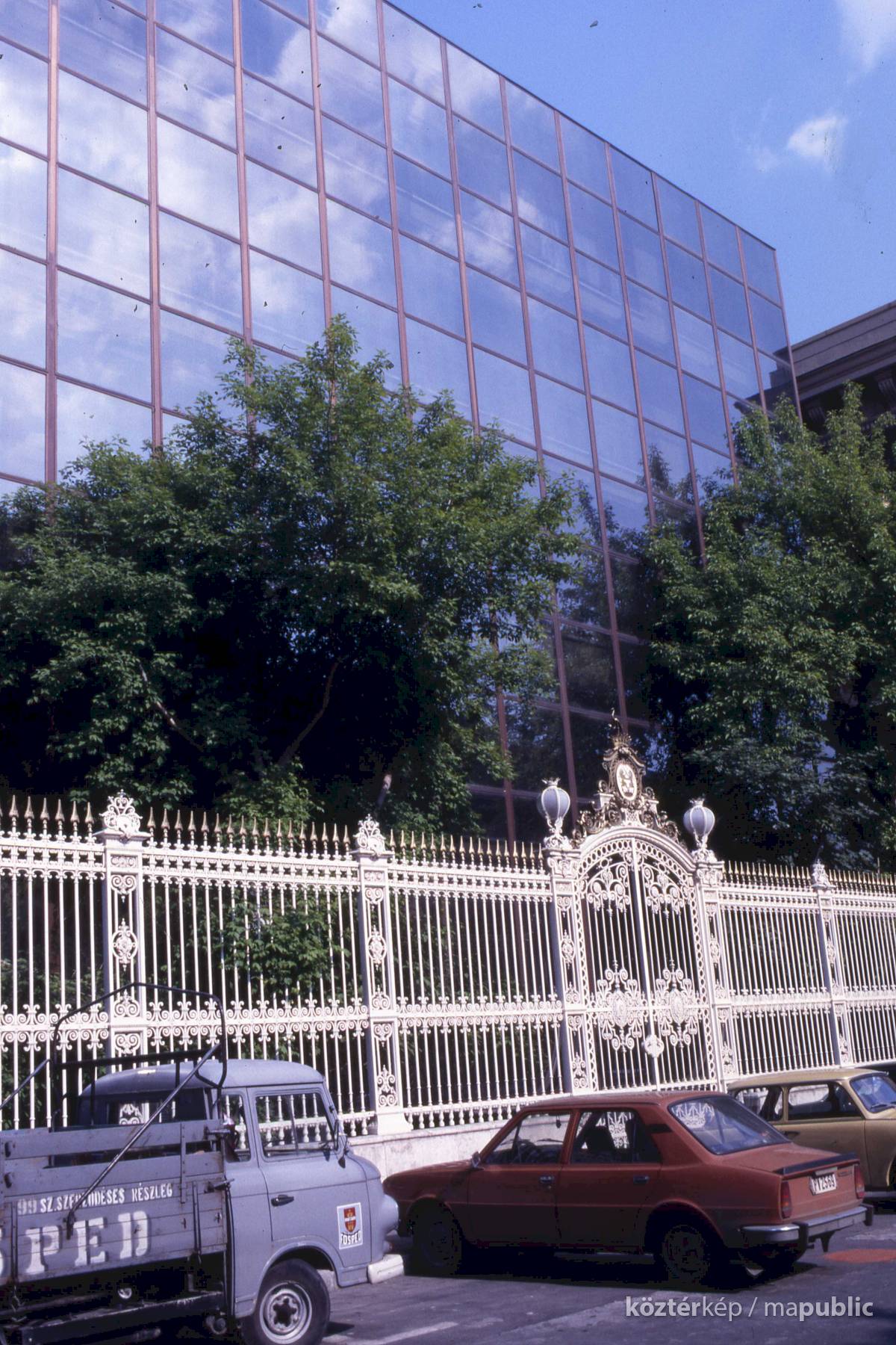 "Megújult a Magyar Rádió Pollack Mihály téri főbejárata: a modem vonalú épület előtt régi formájában állították helyre a volt Festetich-kastélyhoz tartozó park egykori bejáratát és kerítésének egy részét. Mivel a kerítés és a kapu annak idején öntöttvasból készült - és a Műemlék Felügyelőség kikötése miatt mással pótolni nem lehetett ezért rendkívül nagy gonddal kellett elkészíteni az eredetivel megegyező öntőformákat, melyet végül is az Ózdi Kohászati Művek karbantartó műhelye állított elő. A lábazatot a Kőfaragó Vállalat, a szerelést pedig az Iparművészeti Vállalat szakemberei végezték".Kevesebb szöveg