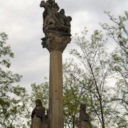 A díszített fejezetű oszlop tetején hagyományos Szentháromság ábrázolás figyelhető meg. Az Atya jobbról egyik kezét a földgolyón nyugtatva másik kezében jogarral, a Fiú bal oldalt kereszttel a kezében, fölöttük közepén sugárnyalábban a Szentlelket jelképező galamb.