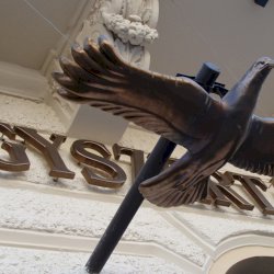 A szerződésben az állt, hogy öt évig nem nyúlhatnak hozzá a homlokzat kialakításához. Ez telt le 2018-ban, és az időközben elkészült, ma látható Sas madárra cserélték az eredeti madarat.