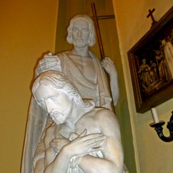 A templomot más célból keresve véletlenszerű találkozásként fényképeztem e talán feles gipsz keresztelést. Hazatérve a kereső segítségével összehasonlítottam néhány azonos témájú szoborral. A szobor két férfiarca percekre lekötötte figyelmem. Szent János jobb keze könyöktájt sérült.