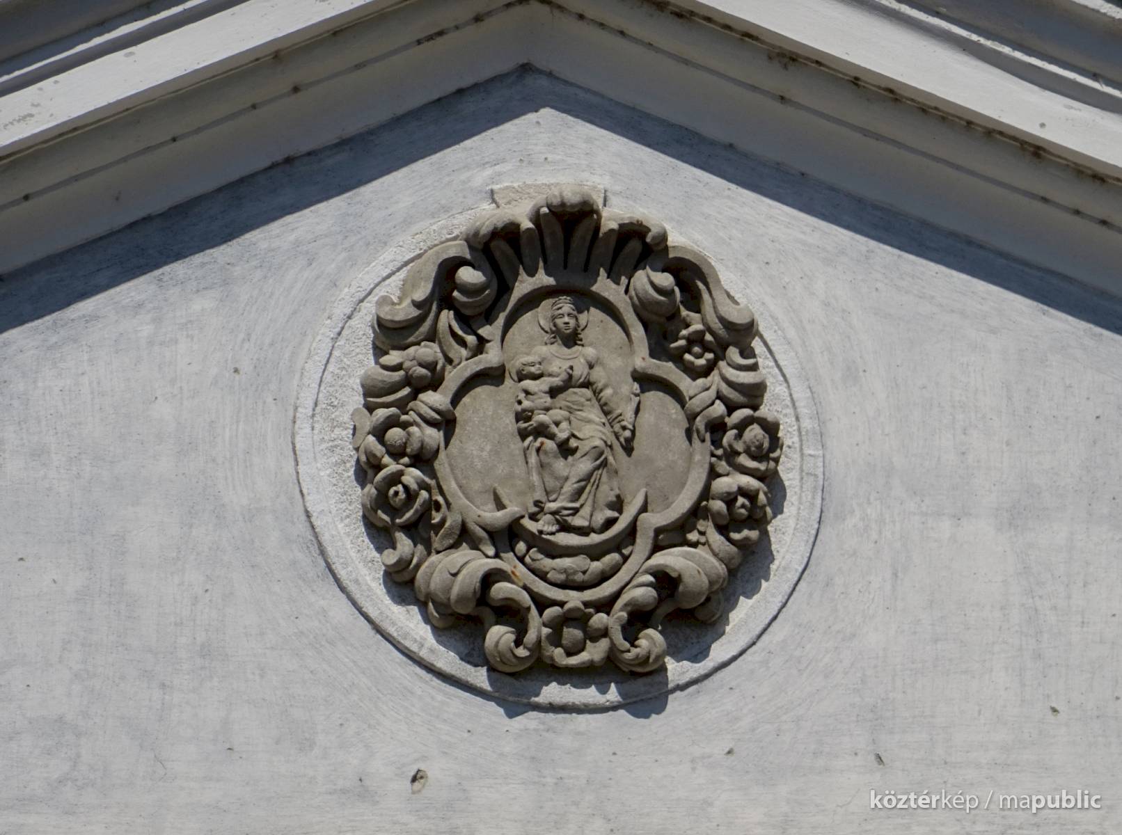 A dombormű témája ugyancsak kapcsolható a naphoz. Egyrészt persze, mert az épület díszítésére készült, másrészt, mivel egyben az ide elképzelhető legszebb anya-gyermek ábrázolások egyike. Díszes, címerszerűen kiképzett keretben Mária alakját ábrázolta a szobrász, jobb karján gyermeke, a kis Jézus ül. Laczik Csaba művén Mária lábát a holdsarlón nyugtatja, fejét stilizált korona díszíti. Bal kezében a jogar, Jézus kezében az országalma látható.