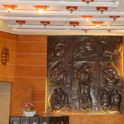 A falon monumentális, nyolc részből készült, kilenc négyzetméteres vörösréz domborítás látható. Az emberi élet szakaszait mutatja be a születéstől a halálig. Középen egy életnagyságú fiatal pár ölelkezik. Körülöttük hét kisebb szimmetrikus, négyzet alakú domborításon jelenetek láthatók, születés, szerelem, gyász, férfi és nő, anya és gyermeke életérzések témakörben.