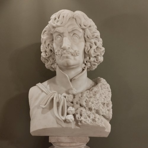 Az alkotás az első állami megbízások között jött létre. Egy 1902-ben megjelent tanulmány szerint Izsó tíz szoborra kapott megbízást egy majdani Nemzeti Panteon számára. Ebből négy, illetve talán öt látható ma a díszlépcsőházban. Két mellszobron semmi jelzés nincs, illetve egyről azt sem tudom, kit ábrázol. Ez a szobor is leltári szám nélkül áll a Magyar Nemzeti Múzeumban. Számtalan forrást, tanulmányt találtam a díszlépcsőházról, sajnos olyan, mintha az itt elhelyezett hat szobor a múzeum mostoha gyermeke volna... A körben elhelyezett freskókról mindent tudunk, a szobrok meg nem érdekesek...