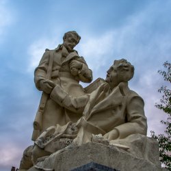 A magas talapzaton a bajtársiasság példája elevenedik meg, amikor sebesült társának ad segítő jobbot az első világháború felszerelésében ábrázolt honvéd.