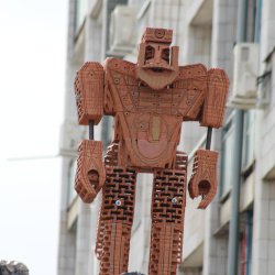 A három híres, helyi kötődésű, Mihály nevű festőművésznek állít emléket. Munkácsy Mihály, Schéner Mihály, Gubis Mihály, a "3M", a három Mihály a tetőn strázsál. A sajátos modern stílusú szobrok egymás mellett állnak, majdnem egyforma magasak. Munkácsyt nagy szakálláról, Schénert testén megjelenő jellegzetes formák, lovacska azonosítják, és Gubist nagy bajusza és a testén látható vésett keresztekről lehet felismerni. Munkácsy vállain olvasható az alkotás évszáma, de alkotói szignót nem találtam, bár lehet hogy ott lapul valahol a sok minta között. Estére a szobrokat alulról megvilágítják, a felületükre kent fényvisszaverő anyagnak köszönhetően igen érdekes látványt mutatnak. [2] A blokktéglák minden oldalát felhasználva, variálva robotszerű, vasakkal drótokkal összeszerelt alkotásokat láthatunk. Tudom hogy szubjektív, de nekem nagyon tetszenek. Életnagyságúak, kockákon állnak és rögzülnek a tetőn. Aki figyelte az alkotó közösségi oldalát, láthatta a tégla-kísérleteket. Sajnos az avatáson nem tudtam részt venni, de ígérem, hogy esti fotókat is töltök fel hamarosan. Köszönöm a múzeum alkalmazottainak a fotózási lehetőséget és a segítséget. Köszönöm az alkotással szemben lévő Csabagyöngye központ alkalmazottjának a "zöld tetőn" engedélyezett fotózást. Mondanom sem kell, hogy nem könnyű fotózni a szobrokat.