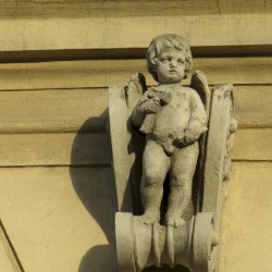 Az utcai homlokzaton az ablakok, illetve a bejárat felett öt kis méretű szobrot láthatunk. Ezek a díszek a ház eredeti rendeltetésének megfelelően a munkára, a tudásra és a tudás gyümölcsére utalnak.