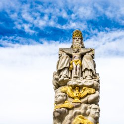 Az aranyszárnyas kerubfejekkel díszített felhőoszlop tetején látható a Szentháromság szoborcsoportja.