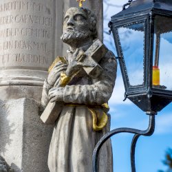 Alakja a kismartoni Pestisoszlopon is látható. Kajetán itt kezében feszületet és Szentírást tart.