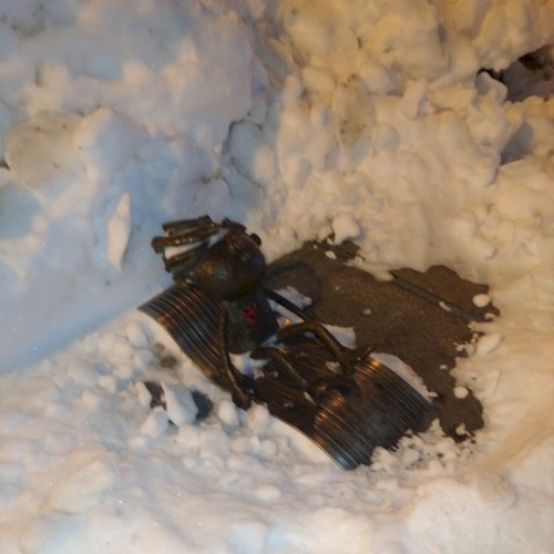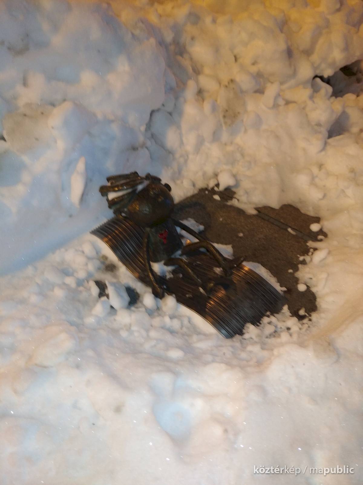 A kicsi, bájos emberke – tüsi hajával, mellén pirosló, mindent adó szívével – szemben a volt áruház üvegépületével. Egy virágágyás szélén csúszik snowboard-jával (vagyis nem nyugágy, ahogy én az úton zötykölődve a kép alapján gondoltam). Talán nem tévedek, ha kapcsolom: ma április elsején legyen a téma is vidám!