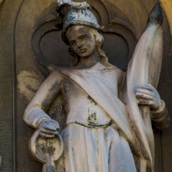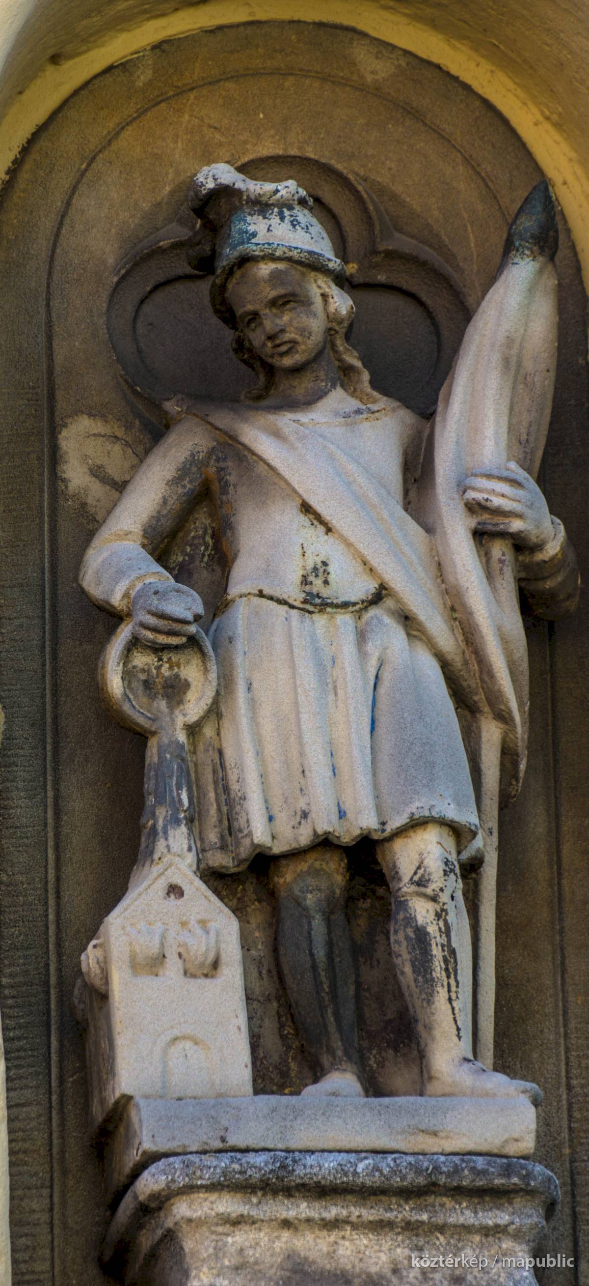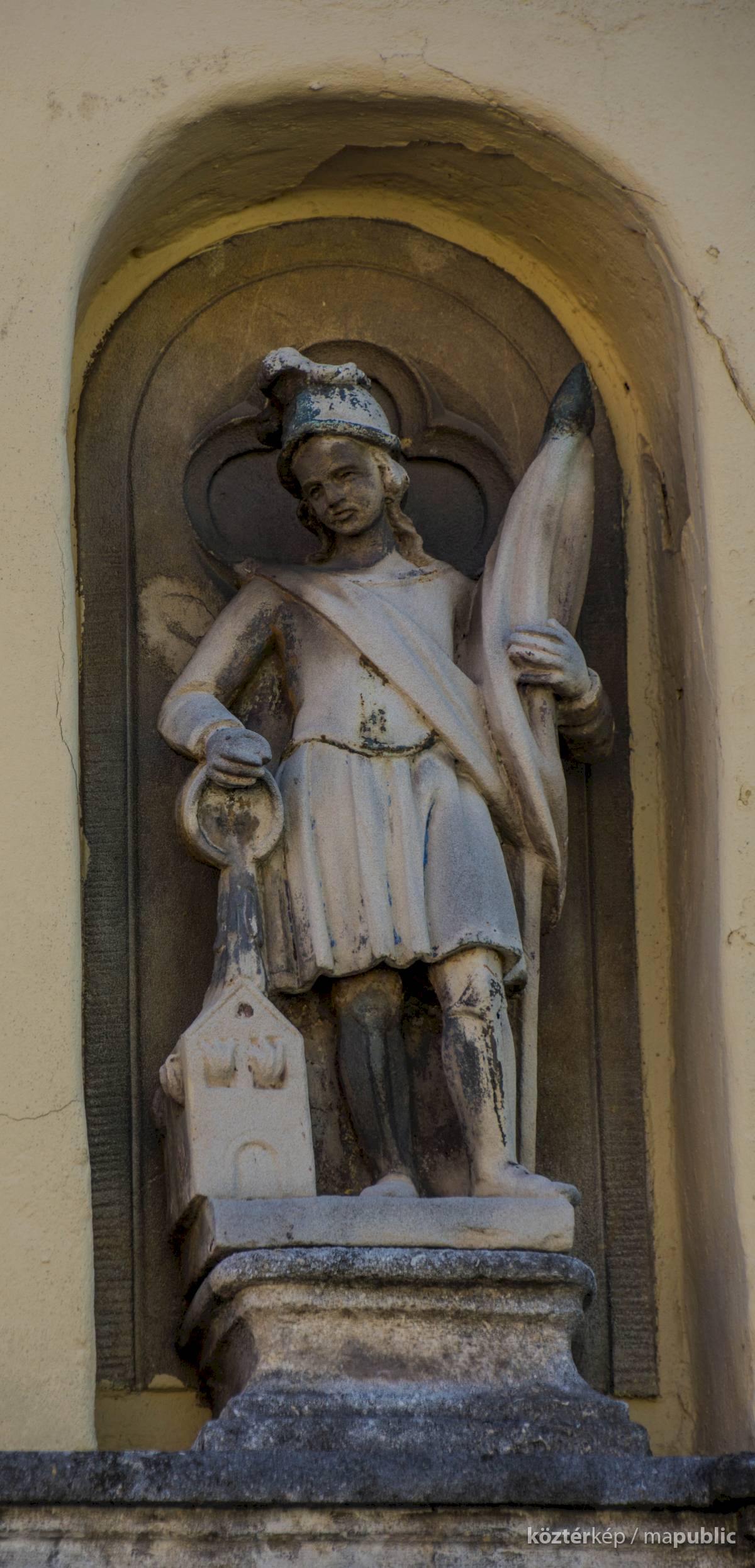 Szent Flórián katonaruhában ábrázolt. Attribútuma: a dézsa, melyből egy égő házra vizet önt. Keresztény hite miatt halt vértanúhalált.[2]