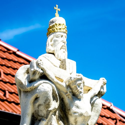 Az Atya kereszttel díszített hármas koronával (tiara) ábrázolt, kezében tartja a kereszten függő egyszülött fiát, a világot megváltó megfeszített Krisztust. Az égből alászálló Szentlelket kiterjesztett szárnyú galamb képében látjuk.