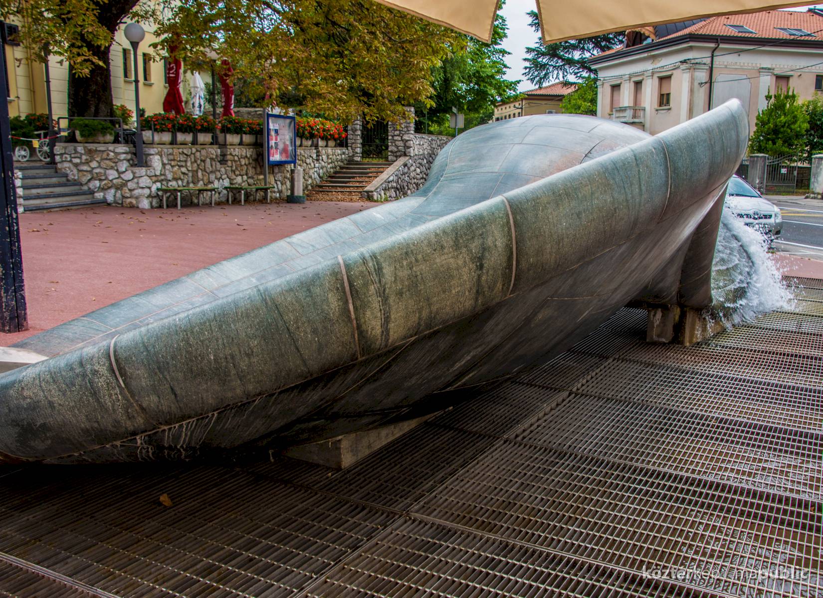 A monumentális szökőkút a várost és tájat szegélyező, az I. világháború borzalmaira emlékeztető hegyek ölelésében a város főterén áll.
