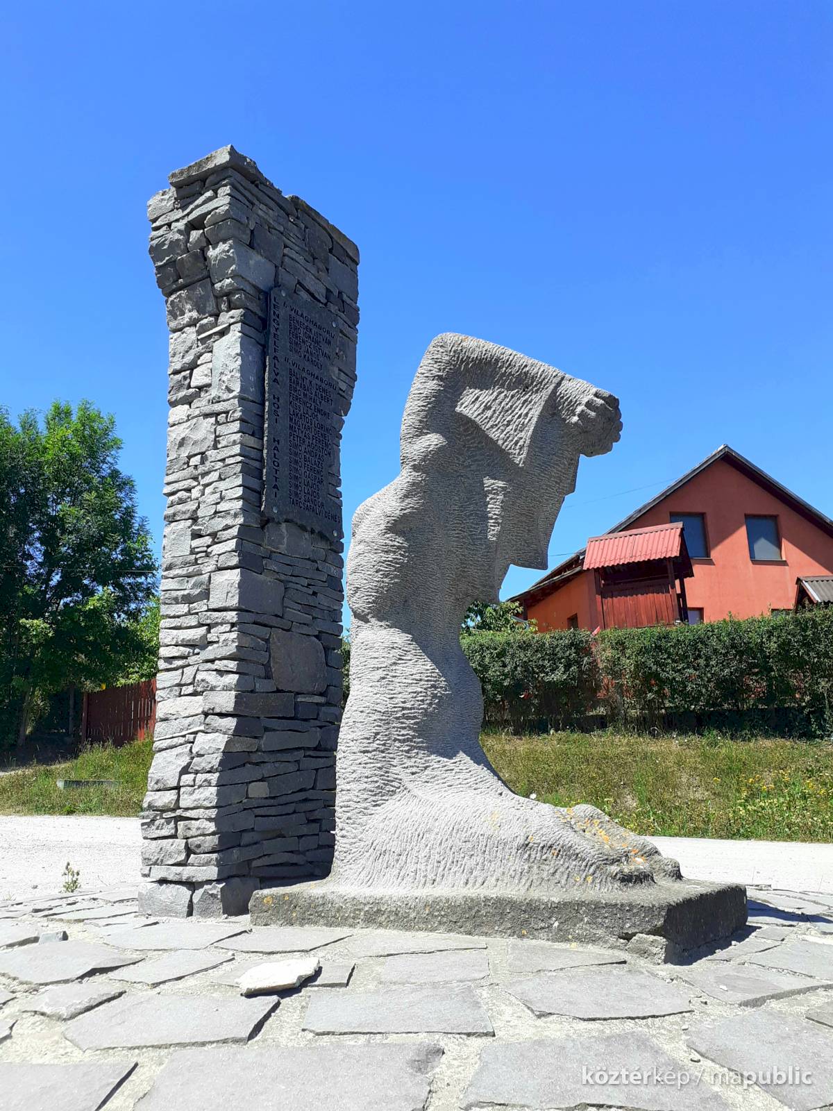 A gömbsüveg talapzat eleve már rendhagyó. Ezen helyezkedik el egy kőlapokból és kisebb kőtömbökből épített oszlop, és erre rögzítve az emléktábla a két világháború székelylengyelfalvi veszteséglistáival. Előtte egy térdelő női alak, aki a fiát gyászoló édesanya, vagy hitveséért zokogó hadiözvegy, és égre emelt kezekkel fohászkodik a Teremtőhöz, vagy éppen a háborúra, annak kirobbantóira szórja haragját." - írja az emlékműről Bodó István, a székelyföldi világháborús emlékművek kutatója, jó ismerője.